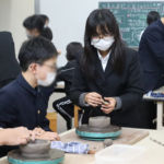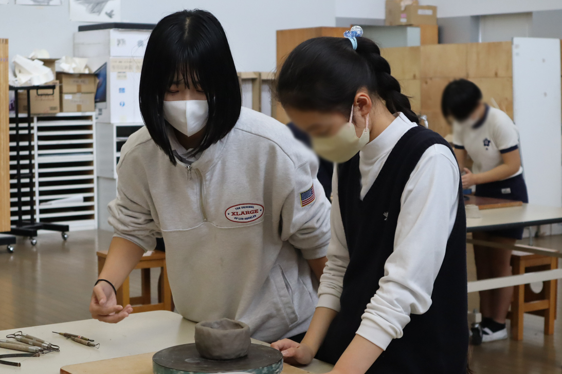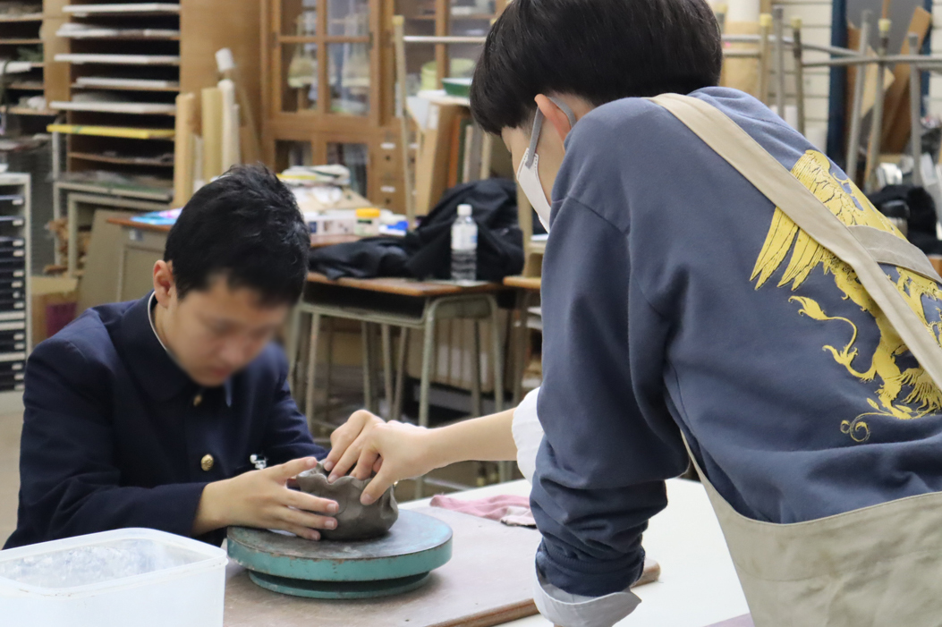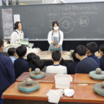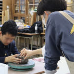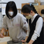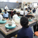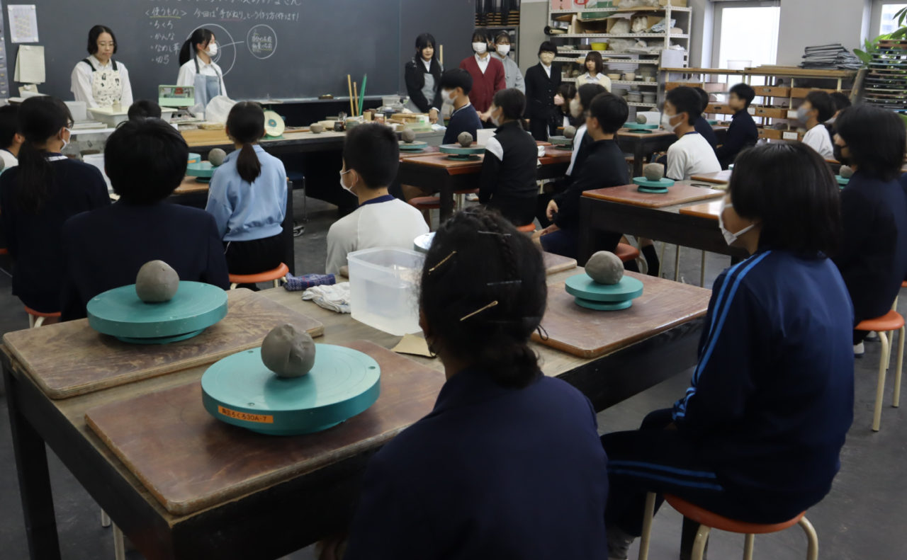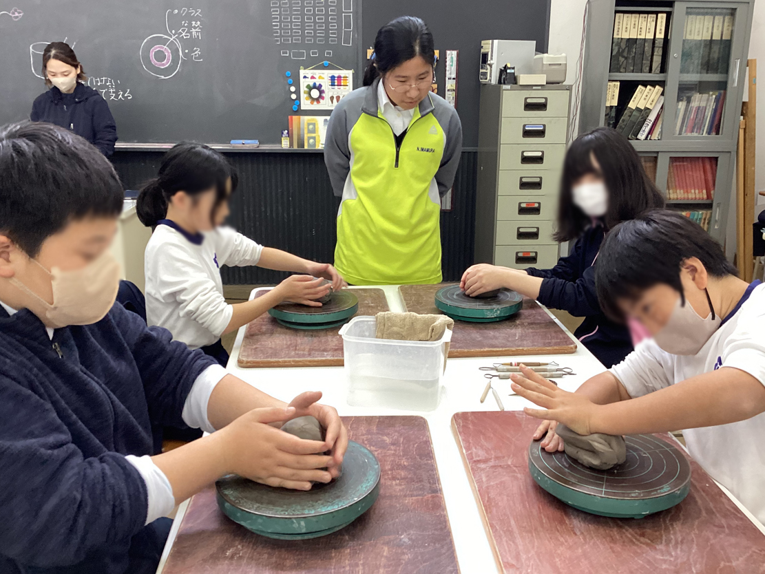 12月15日に白島小学校6年生の児童の皆さんを対象にした陶芸教室を行いました。創造表現コース2年生がスタッフとして参加し、小学生に「手びねり」という手法でのお茶碗づくりを教え、作品制作のサポートをしました。