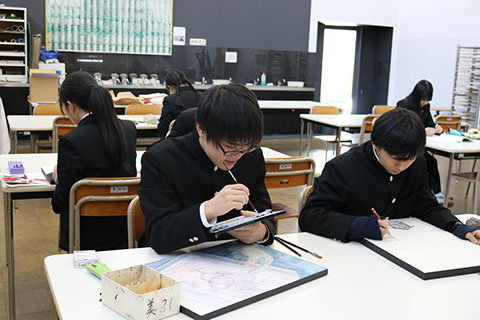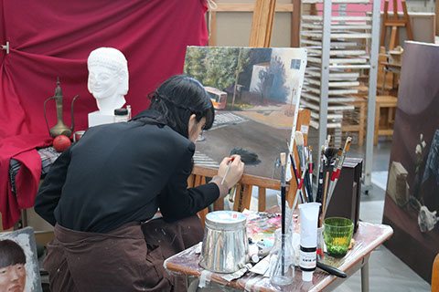 の授業では、技術向上のために、課題に沿って様々な画法を用いて作品を制作しています。